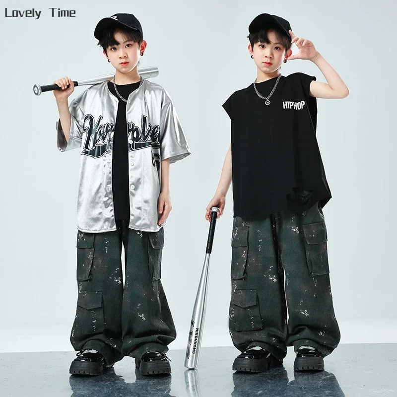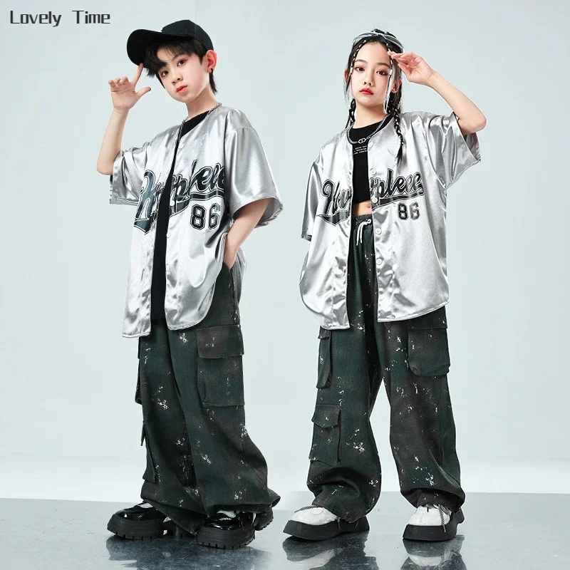 Boys Hip Hop Silver Jacket Street Dance Cargo Pants Girls Cool Streetwear Coat Kids Jazz Clothes Sets Child K-pop Shiny Costumes