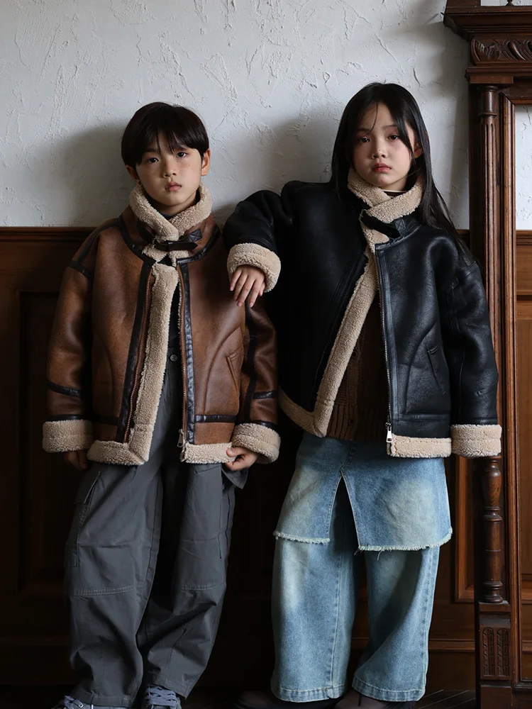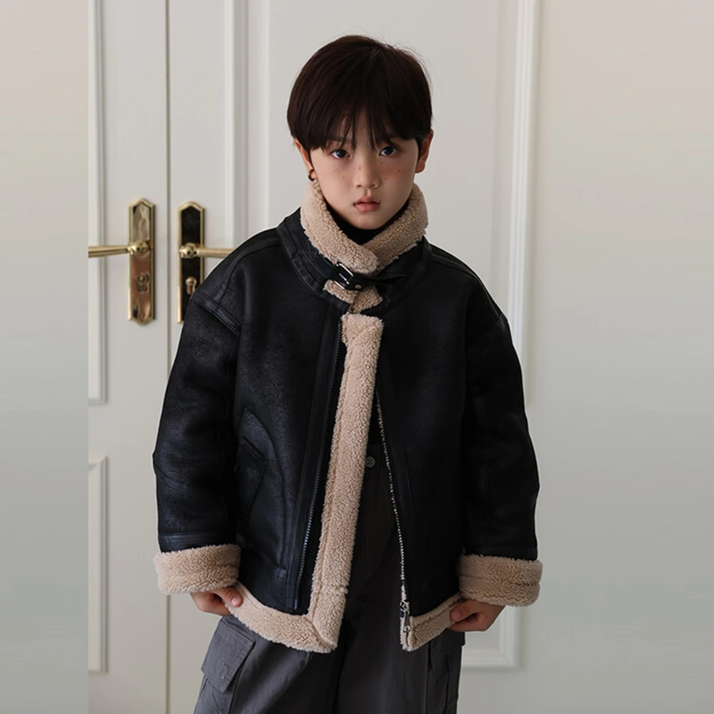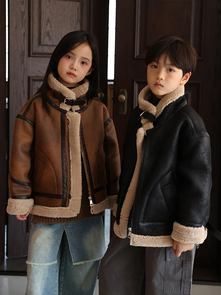 2025 Winter Kids Suede Leather Jacket Boys Girls Faux Fur Coat Thick Warm Fleece Outerwear Teen Children Top Clothes 2-15 Years